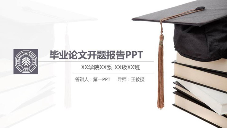 首页右侧放置一摞书籍和一个博士帽PPT背景图片,左侧放置毕业学校logo,和毕业论文开题报告PPT标题文字。界面简洁实用。