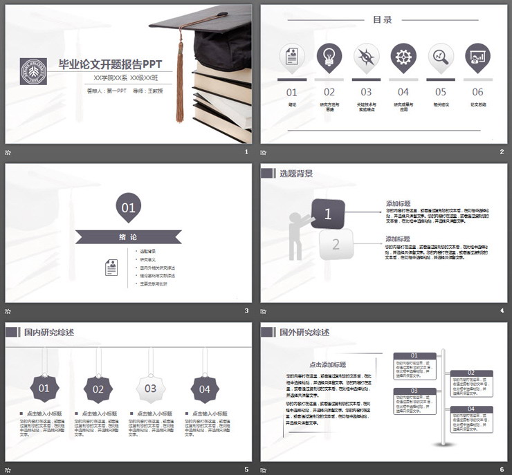 PowerPoint模板内容页,由26张淡雅灰色幻灯片图表,搭配毕业论文开题报告文案排版。另外使用了多张科学实验插图装饰。