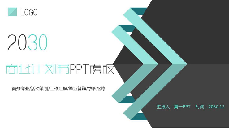 PPT模板使用了黑色与青色搭配的个性多边形PPT背景图。左侧填写商业融资计划书PPT标题文字。界面简约商务。