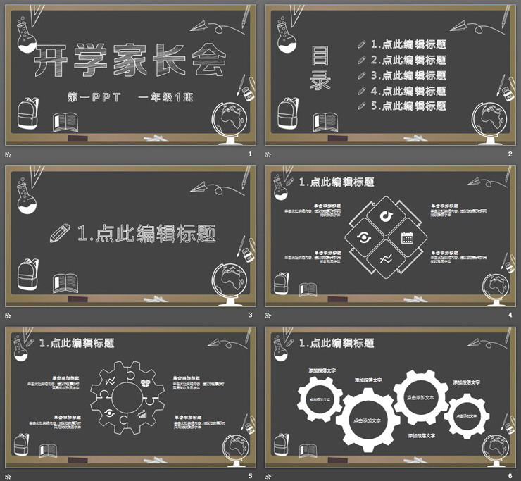 PPT模板使用了一张棕色黑板PPT背景图。首页放置白色书包、课本、地球仪、铅笔、以及教学器材PPT插图。中间使用白色粉笔手绘字体填写,开学家长会PPT标题。界面背景与学校开学PPT主题搭配。