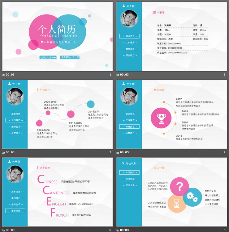 蓝粉圆点背景的清新个人简历PPT模板,共20页;