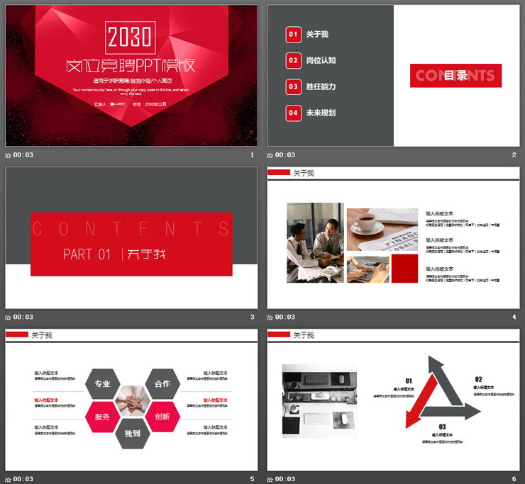 PowerPoint模板内容页,由22张红色灰色配色的幻灯片图表,搭配个人竞聘文字排版。