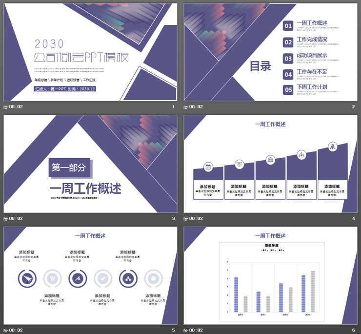紫色多边形背景公司周例会工作汇报PPT模板,共30页;