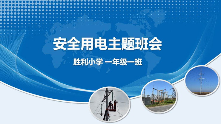 PPT模板首页使用了蓝色曲线、电力传输设备、高压电线等背景图片。中间填写用电安全主题班会PPT标题。