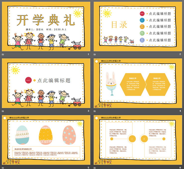 PPT模板以黄色为主色调,卡通风格设计。PPT首页使用了5个卡通涂鸦风格的小朋友背景图片。中间填写开学典礼PPT标题。界面卡通可爱。