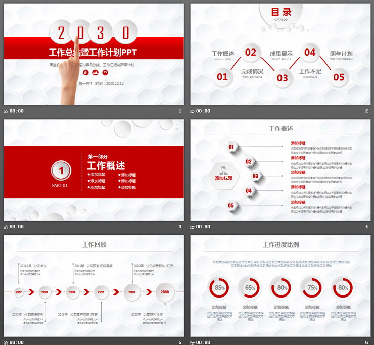 PPT模板使用了微立体风格设计,首页中间放置四个带有动态效果的微立体圆形,填写汇报时间。中间放置红色长条,由动态人物手势引导出,工作总结计划PPT标题。PPT模板设计简洁实用,算得上是经典微立体模板。