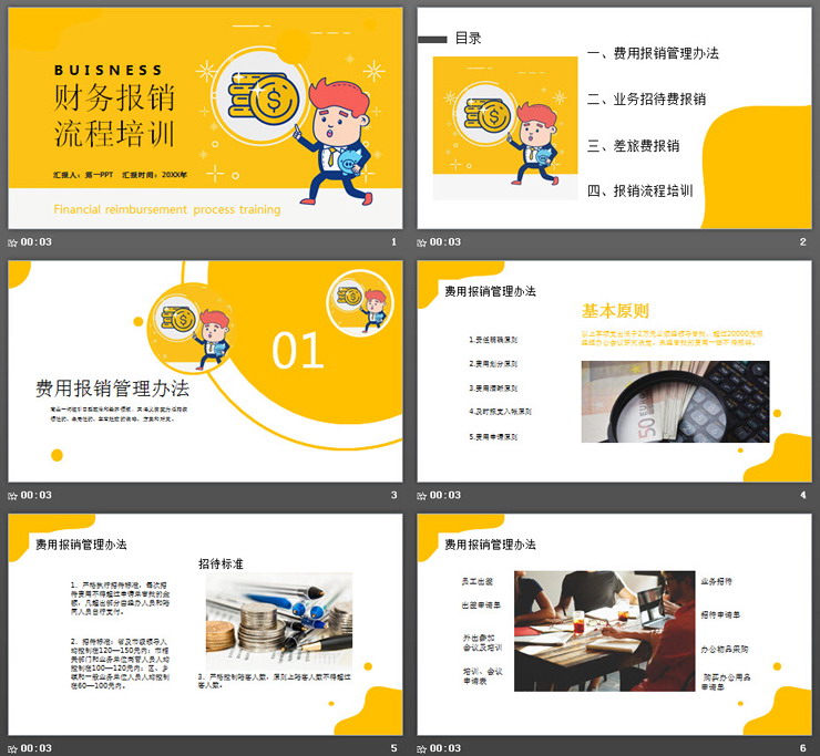 PPT模板采用了黄色主题色。封面放置卡通财务人员和金币图标,左侧填写企业公司财务报销流程培训PPT课件标题。