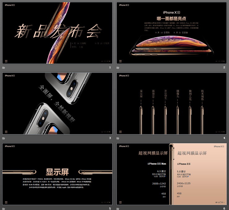 PPT模板使用了黑色背景。PPT封面放置金色苹果新品手机背景图片,和发布会标题。界面简洁精致。