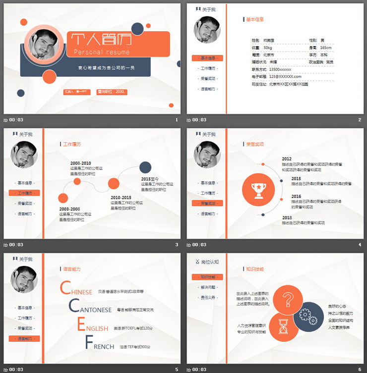 个人简历PPT主要介绍了:基本信息、工作履历、荣誉奖项、语言能力等信息。