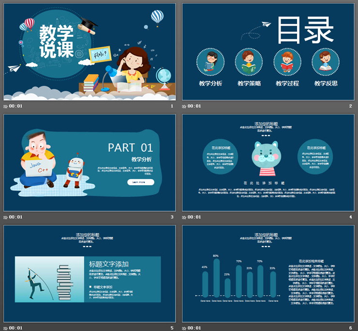 PowerPoint模板内容页,由22页蓝色动态幻灯片图表,搭配PPT文字排版。另外使用了卡通学生PPT插图、课堂PPT插图、课本PPT插图等装饰。