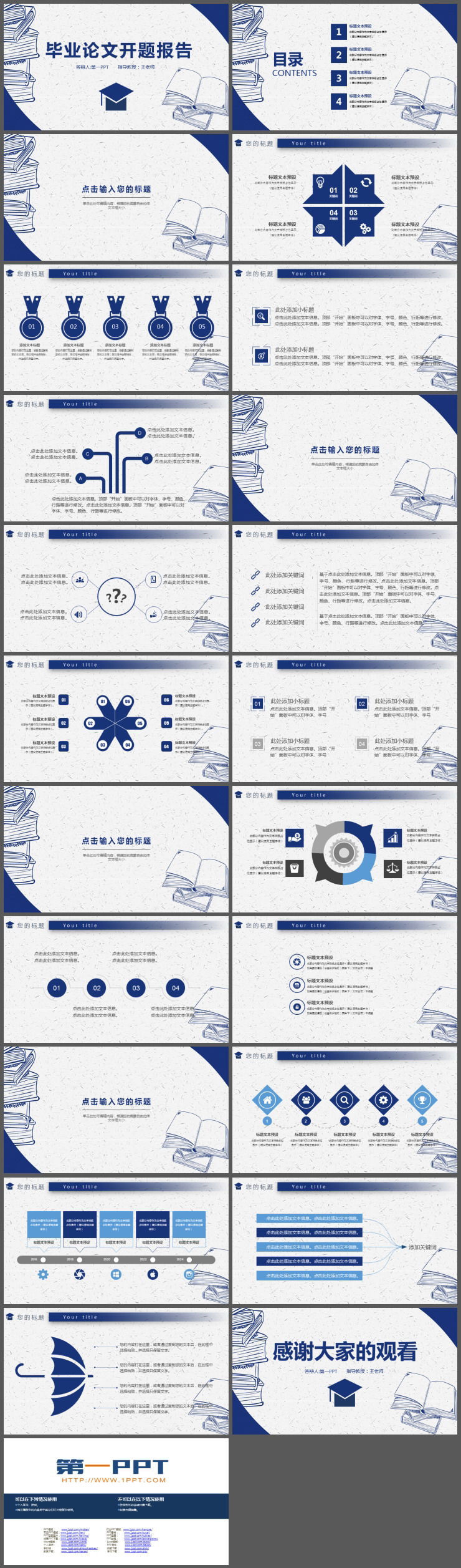 PowerPoint模板内容页,由18张蓝色动态幻灯片图表,搭配开题报告文字排版。