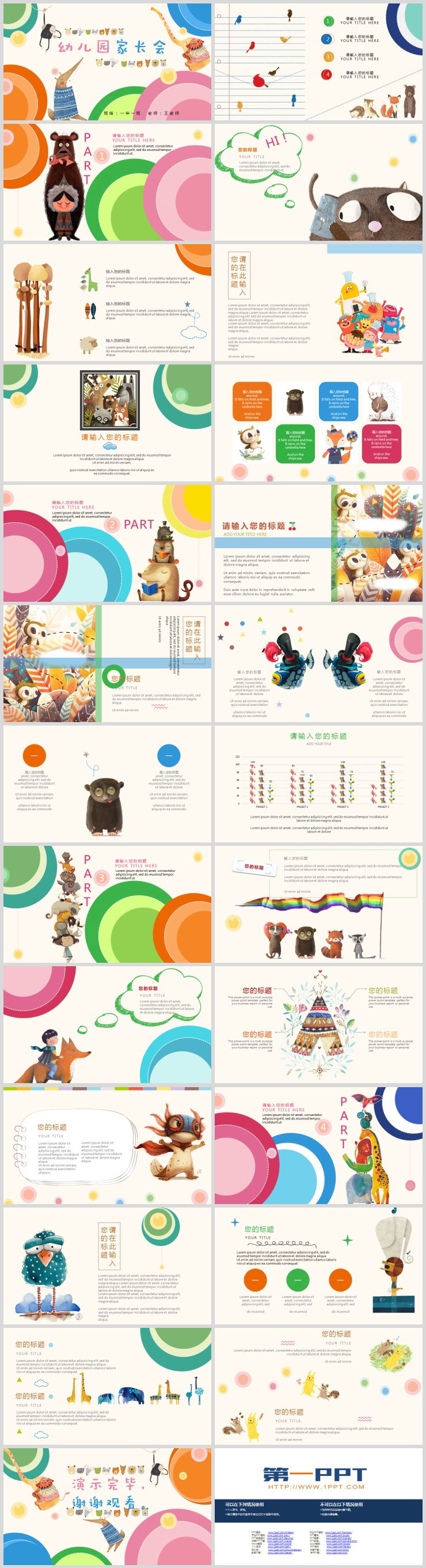可爱卡通小动物背景幼儿园家长会PPT模板,共25页;
