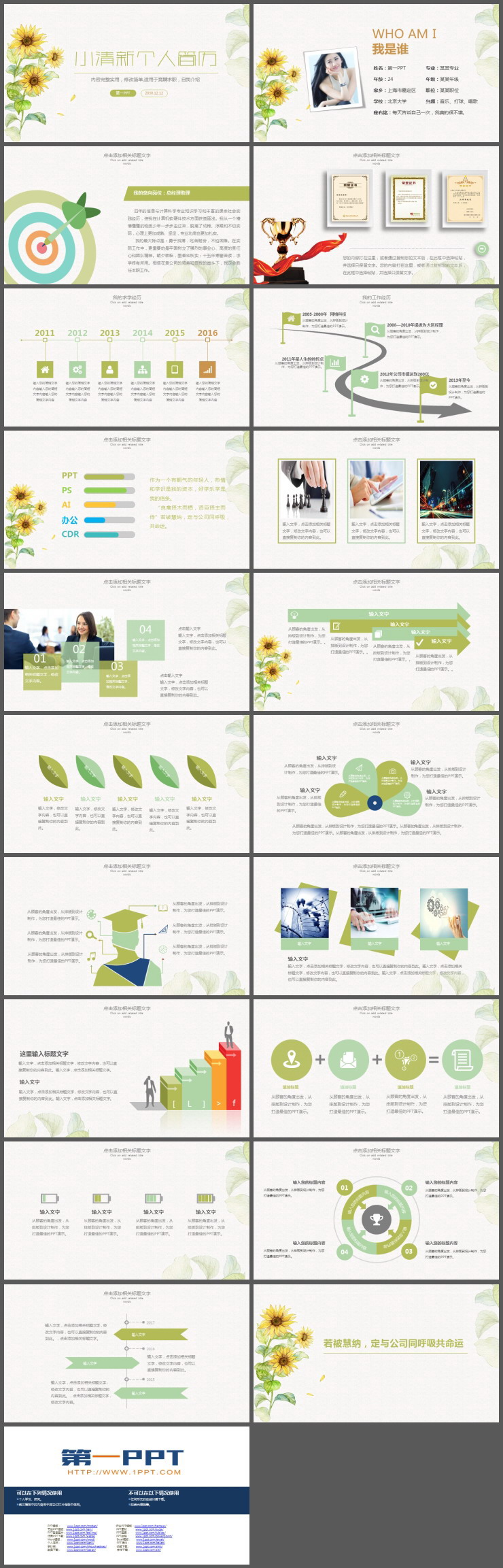 PowerPoint模板内容页,由18张绿色动态幻灯片图表,搭配个人简历PPT文字排版。