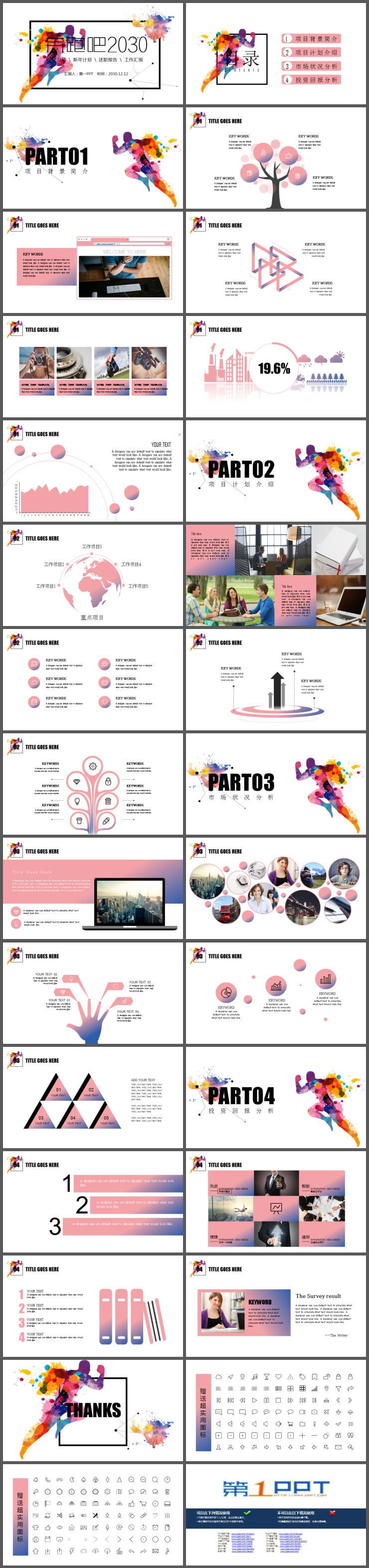 简洁炫彩奔跑人物背景的新年工作计划PPT模板,共29页;
