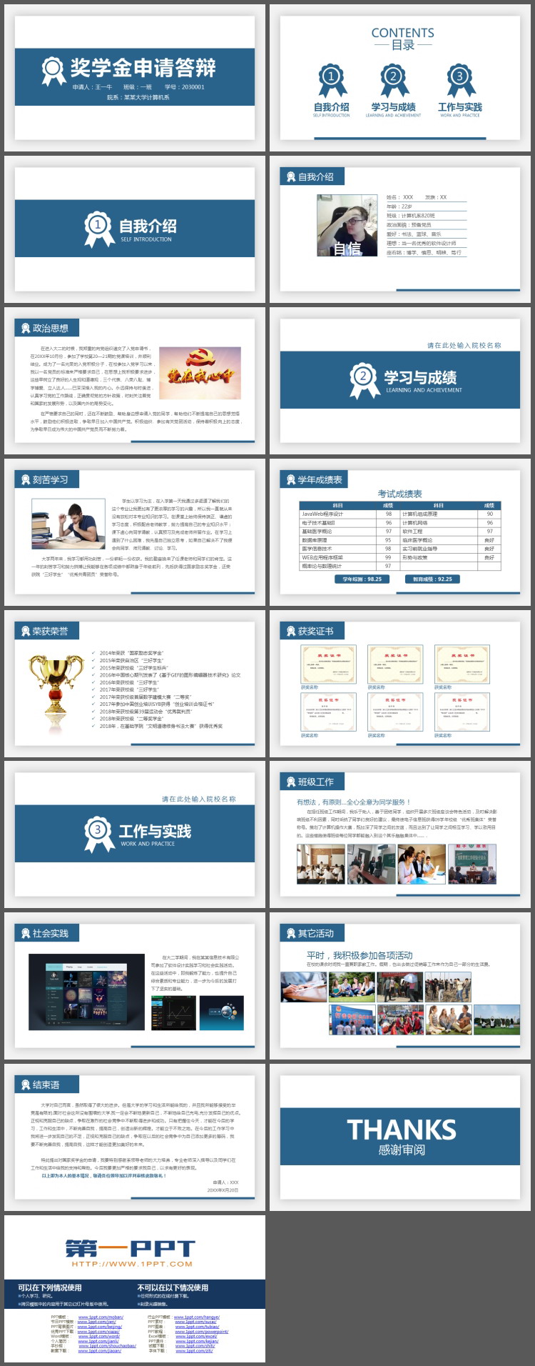 蓝色简洁大学奖学金申请答辩PPT模板,共16页;