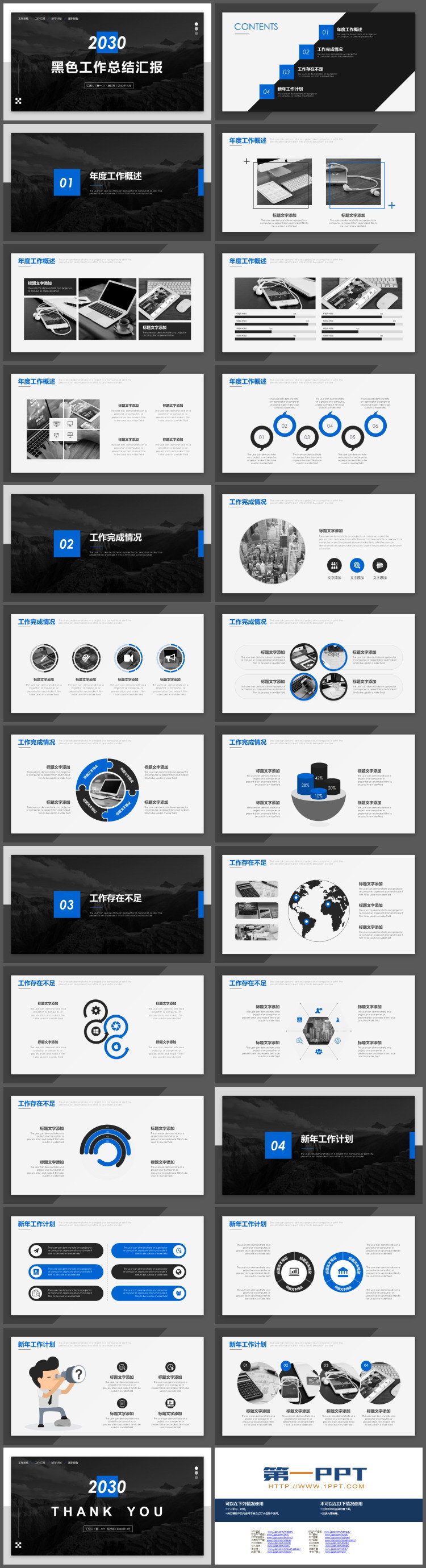 PowerPoint模板内容页,由23张蓝色黑色配色的幻灯片图表,搭配PPT文字排版。另外使用了扁平化商务人物插图、办公桌面插图、商业建筑插图等装饰。