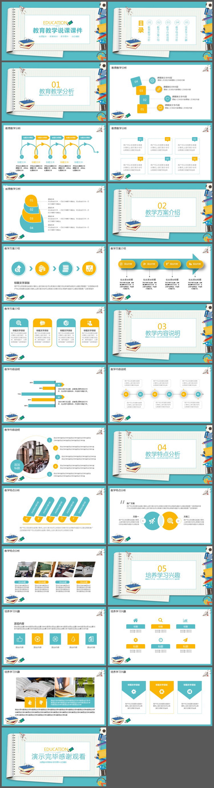 PowerPoint模板内容页,由22页蓝色黄色配色的幻灯片图表,搭配PPT文字排版。另外使用了教室PPT插图、书籍PPT插图等装饰。