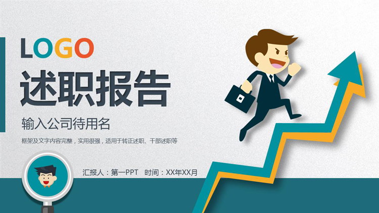 PPT模板封面使用了,行走在上升箭头上的,手拿公文包的卡通小人PPT背景图片。左侧填写个人述职报告PPT标题。最下方卡通头像,可以根据需要,替换成个人照片。
