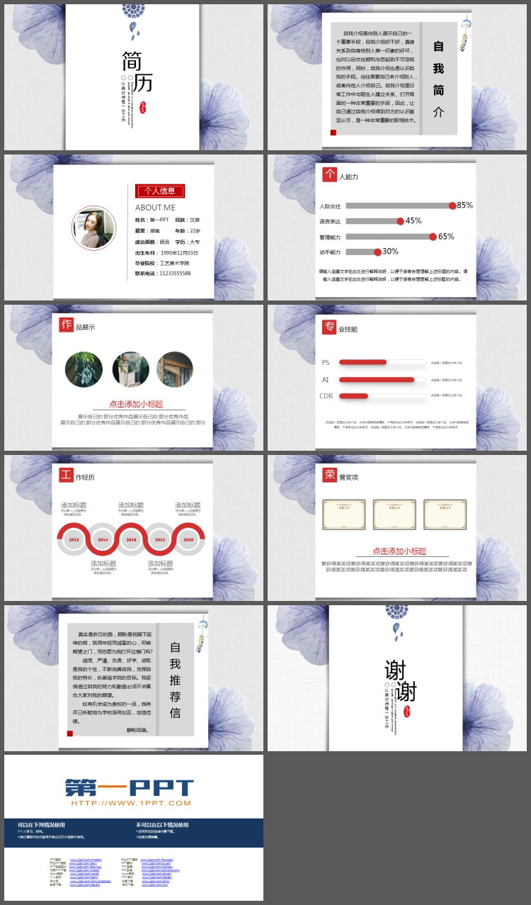 这是一套紫色花朵背景的简洁个人简历PPT模板,共10页;