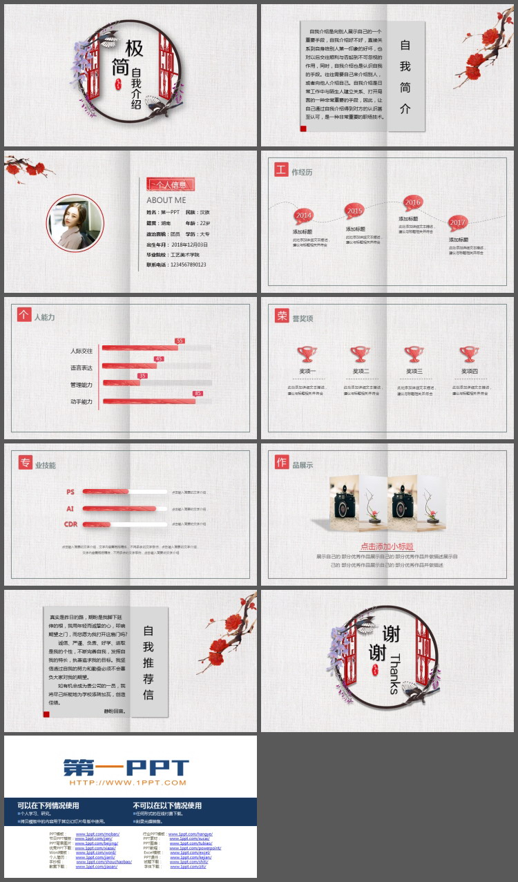这是一套红色古典雅致自我介绍PPT模板,共10页;