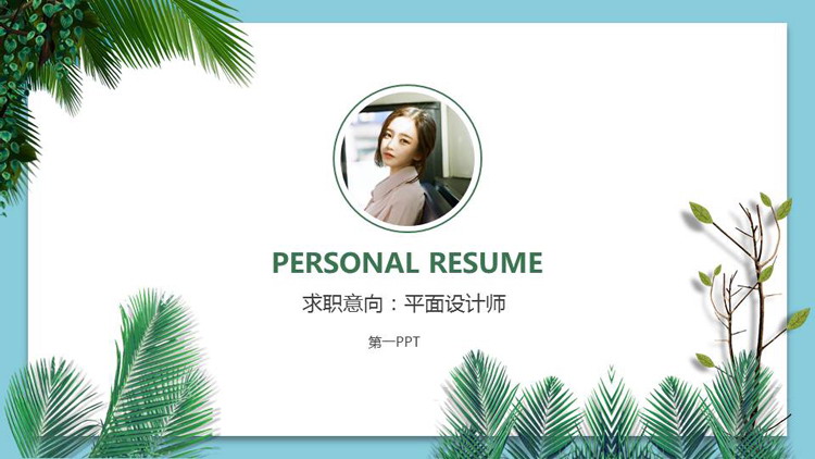 PPT模板使用了多种绿色植物叶子背景图片。PPT模板封面中间放置圆形个人头像,下方填写个人简历PPT标题,和求职意向等信息。界面风格简洁清新。