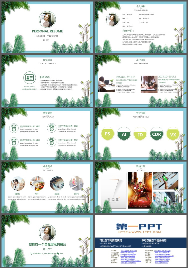 这是一套蓝色植物叶子背景的个人简历PPT模板,共9页;