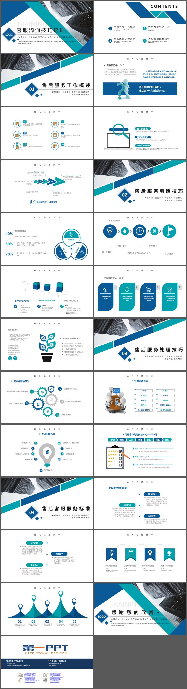 PowerPoint模板内容页,由22张蓝绿配色的幻灯片图表,搭配培训PPT文字排版。另外使用了3d小人PPT插图装饰。