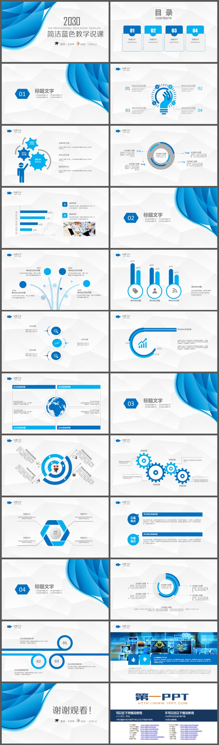 这是一套简洁蓝色抽象曲线背景的教学说课PPT模板,共23页;