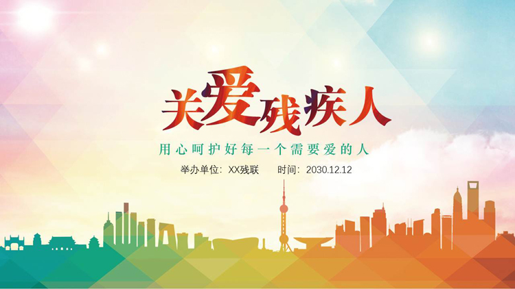 PPT模板封面使用了彩色低平面多边形风格的,城市剪影PPT背景图片。中间填写关爱残疾人PPT标题。用心呵护每一个需要爱的人。