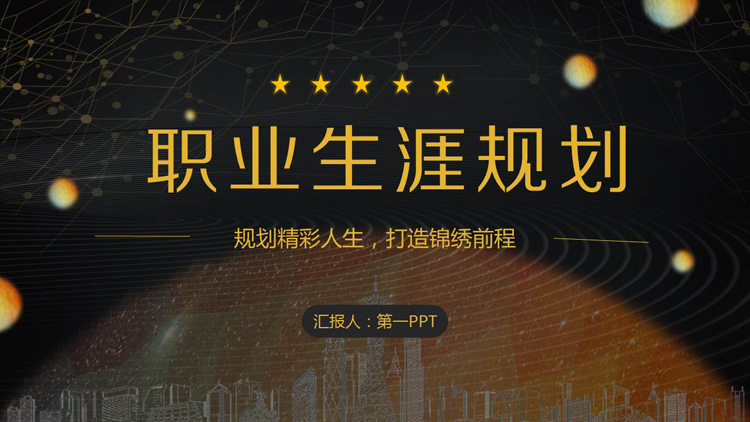 PPT模板以黑色作为主题色。PPT封面使用了多边形星球、金色点线、五角星等背景元素。中间填写大学生职业规划PPT标题。界面风格大气使用。