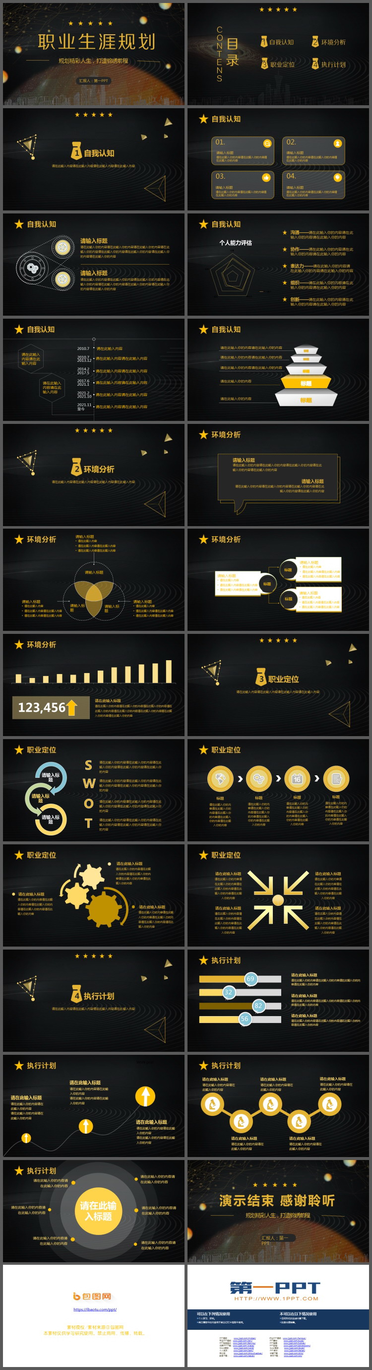 这是一套大气黑金风大学生职业生涯规划PPT模板,共24页;