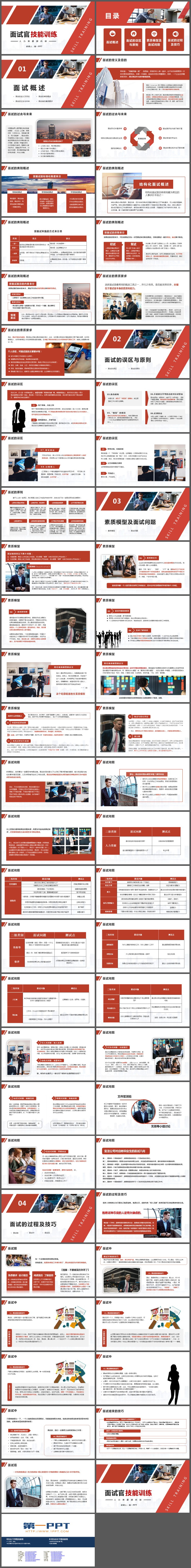 PPT以红色为主色调设计。PPT封面使用了职场人物背景图片,左下方填写 人力资源培训之面试官技能训练PPT标题。界面风格简洁商务。