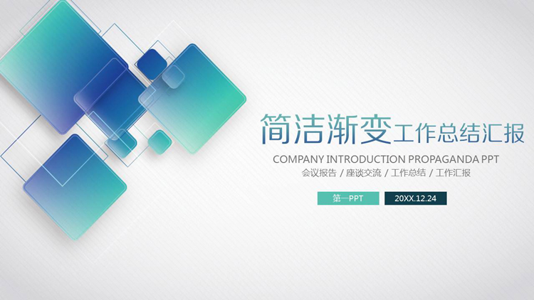 PPT模板封面使用了多个蓝绿渐变的方形背景图片。右侧填写工作汇报PPT标题。界面风格简洁实用。
