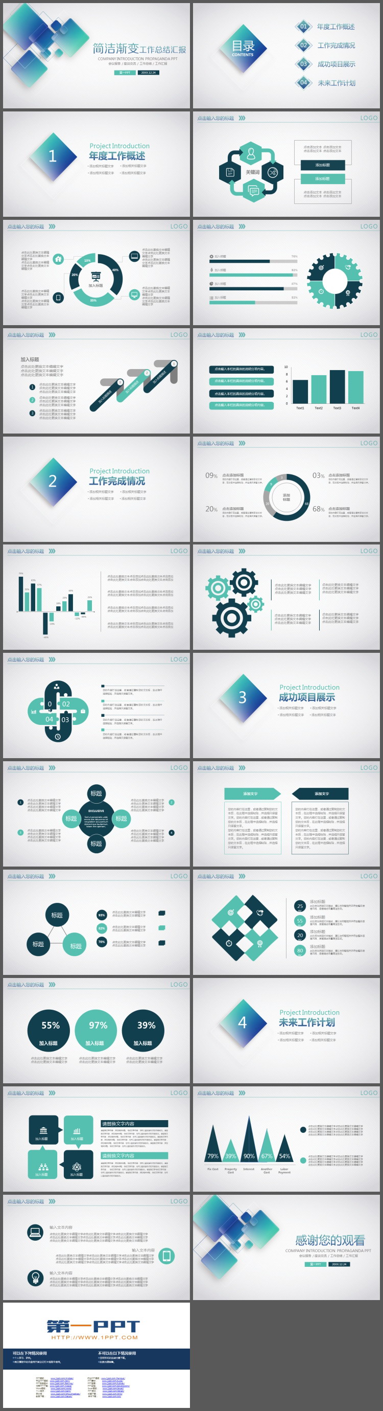 PowerPoint模板内容页,由22张蓝色绿色配色的幻灯片图表,搭配PPT文字排版。