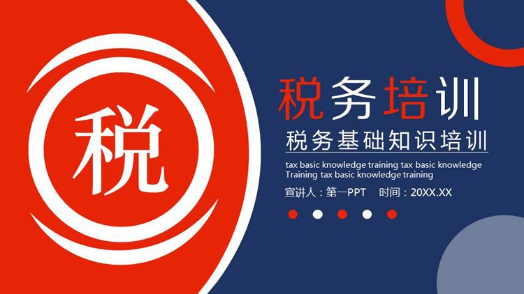 PPT模板封面使用了红蓝拼色背景。右侧填写税务基础知识培训PPT标题。