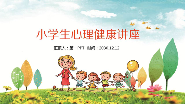 PPT一卡通风格设计制作。首页使用了老师带领小学生野外郊游背景图片。中间填写小学生心理健康讲座PPT标题。界面风格卡通可爱。