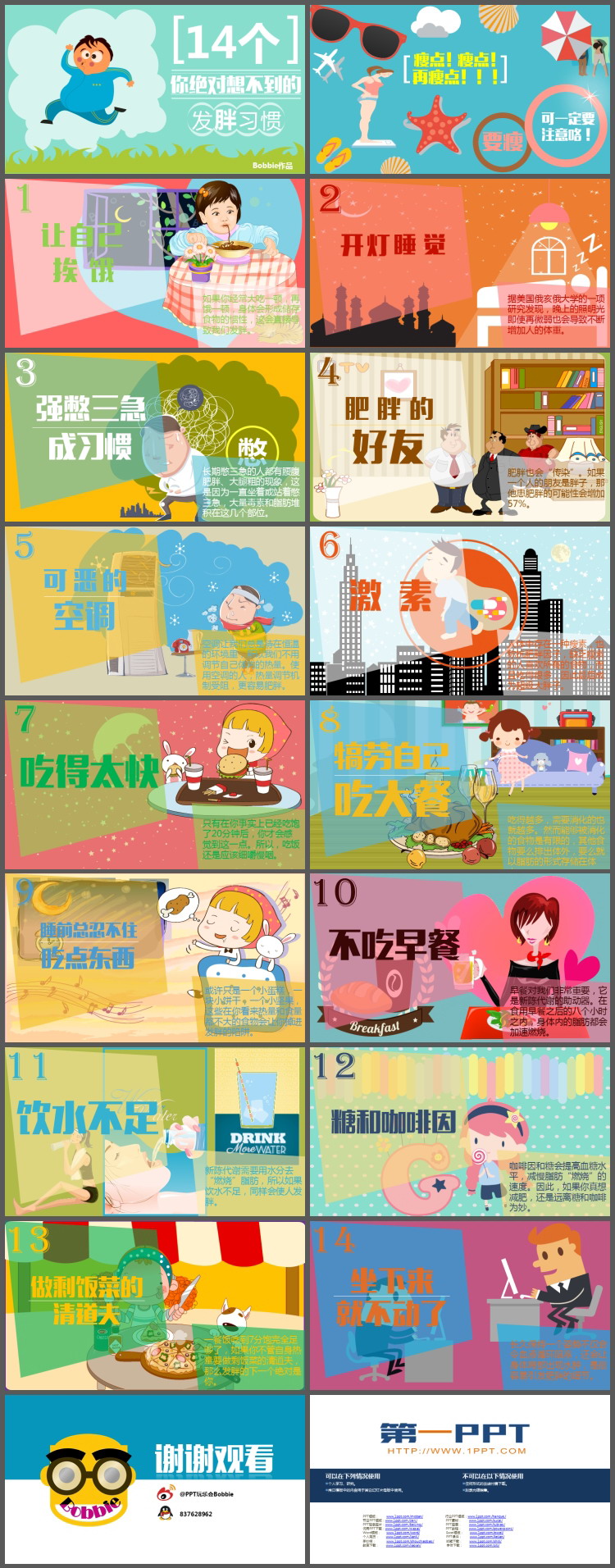 PPT模板以卡通风格设计制作,讲述了让你肥胖的14个不好的生活习惯。