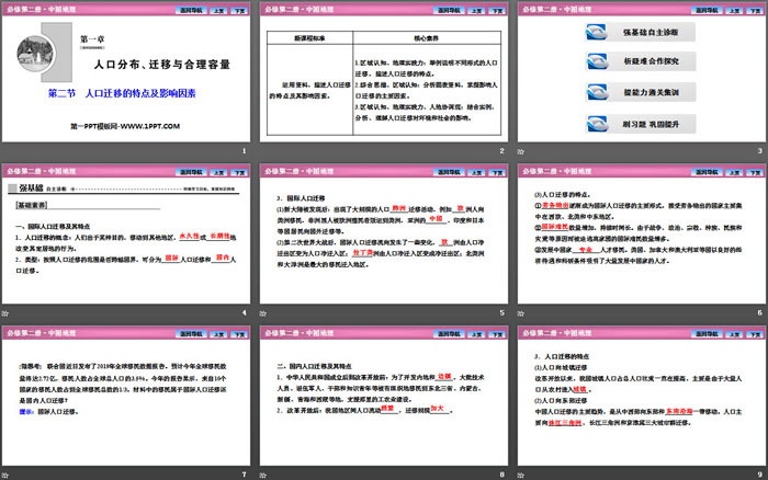 关键词:中图版高中地理必修二PPT课件免费下载,人口迁移的特点及影响因素PPT下载,人口分布迁移与合理容量PPT下载,.PPT格式;