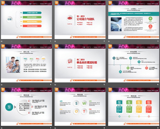 这是一套彩色微立体公司简介PPT图表,共23张,第一PPT模板网提供精美幻灯片图表免费下载;