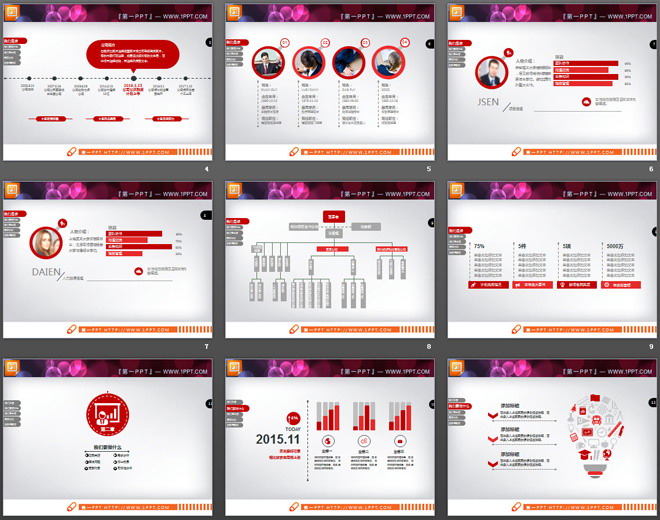 这是一套红色扁平化公司简介PPT图表大全,共39张,第一PPT模板网提供精美幻灯片图表免费下载;