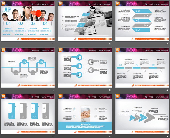 这是一套扁平化风格的蓝灰组合工作汇报PPT图表,共20张。第一PPT模板网提供精美工作汇报幻灯片图表免费下载;
