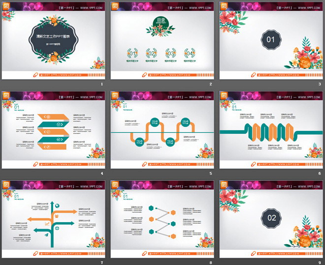 这是一套扁平化风格的,复古清新花卉背景,艺术PPT图表大全。共26张。第一PPT模板网提供文艺清新幻灯片图表免费下载;