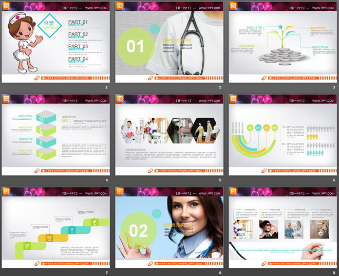 这是一套彩色清新医疗PPT图表,共24张。第一PPT模板网提供医疗医院幻灯片图表免费下载;