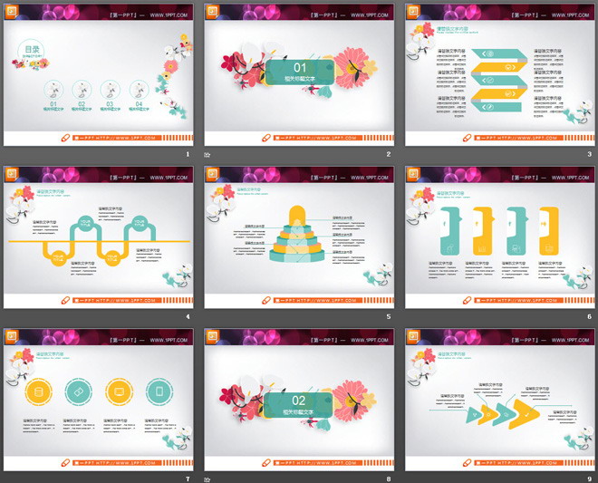 这是一套清新文艺花卉背景的扁平化PPT图表,共24张,第一PPT模板网提供精美幻灯片图表免费下载;