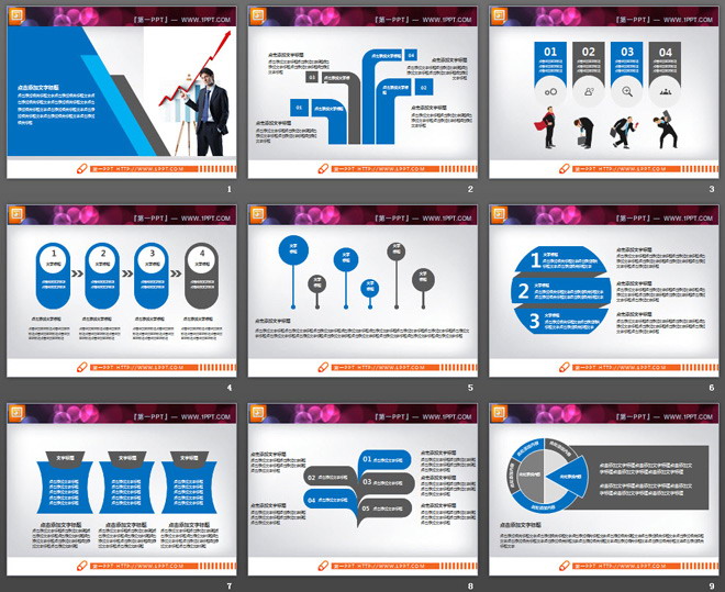 这是一套蓝灰扁平化商务PowerPoint图表,共20张。第一PPT模板网提供精美幻灯片图表免费下载;