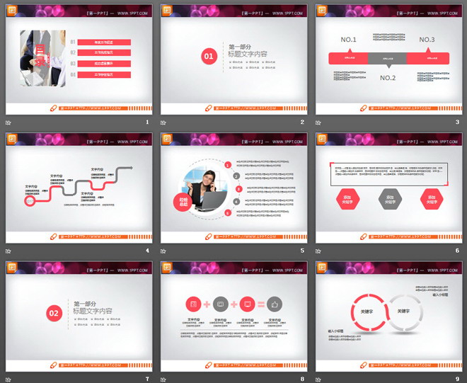 这是一套简洁粉色扁平化设计风格的,年终工作总结PPT图表大全,共21张。第一PPT模板网提供精美幻灯片图表免费下载;