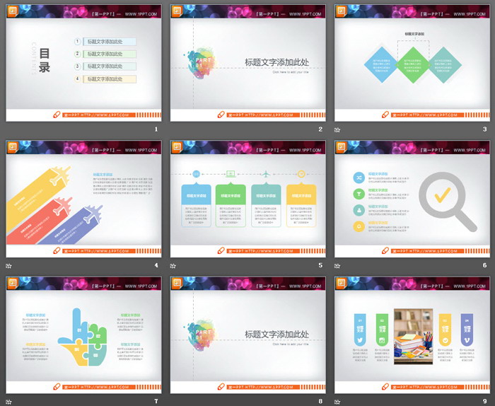关键词:彩色幻灯片图表,精致动态扁平化PowerPoint图表打包下载,.PPTX格式;