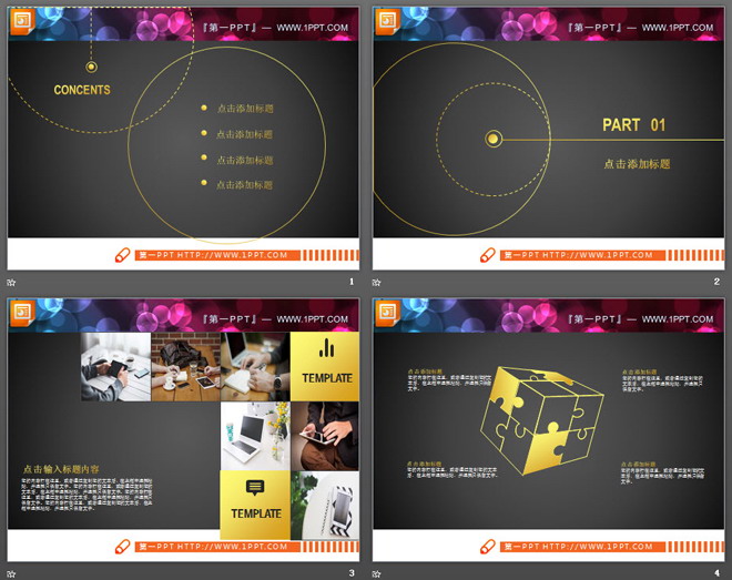这是一套金色扁平化设计风格的,商务汇报PPT图表大全,共26张。第一PPT模板网提供精美幻灯片图表免费下载;