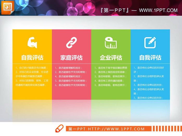 这是两张彩色扁平化风格的,并列关系PPT图表。使用了红黄蓝绿四种颜色填充。.PPTX格式;