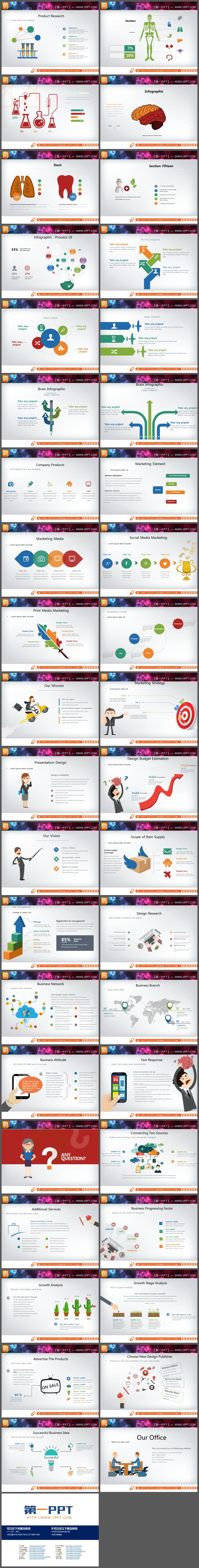 40页国外生物科学类PPT图表合集。PPT图表采用了彩色扁平化风格设计制作。图表包括:实验场景、人体结构、人体器官、科学工作者等。.PPTX格式;